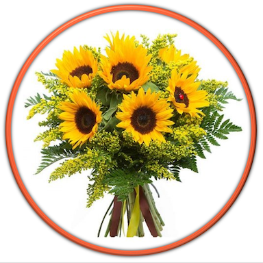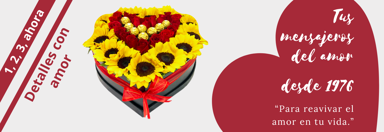 Arreglo floral de girasoles, rosas rojas y chocolates en forma de corazón. 34 X 13 cm. Envío a domicilio en CDMX, regalos originales, entrega garantizada de flores.